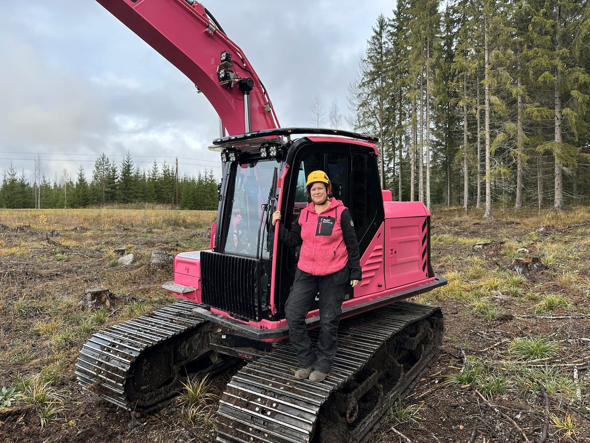 Iloista väriä muokkaustyömaalla – Metsätyö Mannisen pinkki kaivuri saa hymyn huulille